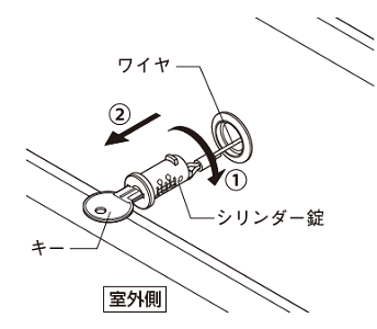 左(反時計まわり)に90°回転させてください。(下図①) - シリンダー錠を抜き(下図②)、外部手動切替用ワイヤをいっぱいまで引きながら、